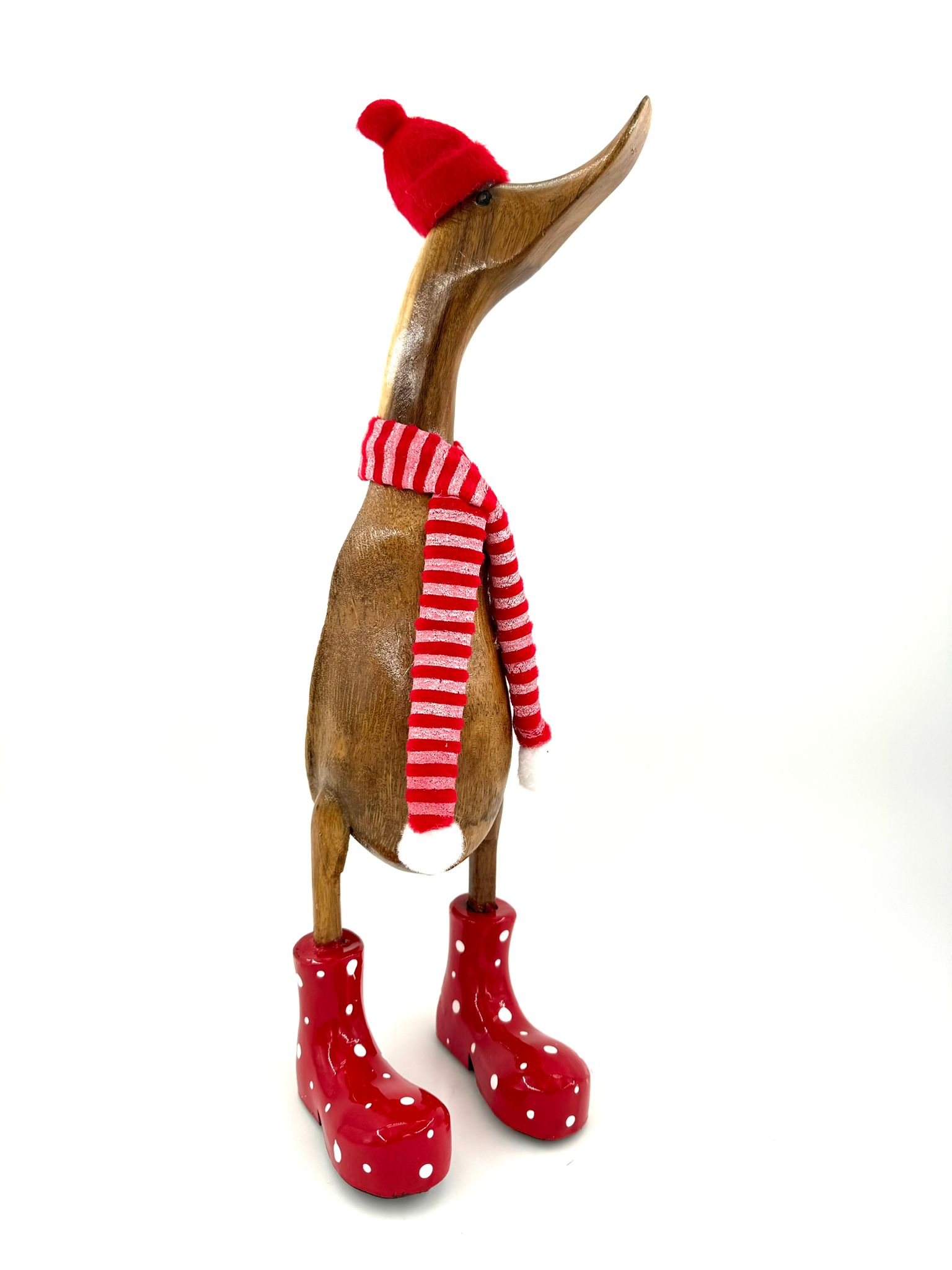 Erwecken Sie die Neugierde Ihrer Kinder mit Alia - Holzente! Mit ihrer roten Pudelmütze und dem passenden Schal sowie den wasserfesten, roten Regenstiefeln ist sie 40 cm hoch und bereit für jedes Abenteuer. Lassen Sie sie die Natur entdecken und erleben Sie unvergessliche Momente zusammen!