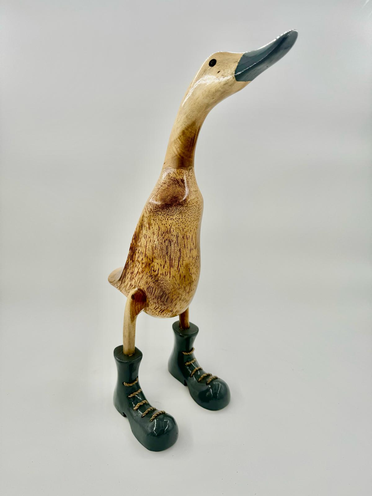Entdecke die einzigartigen grauen geschnürten Schuhe von Kalle - Holzente! Diese 25cm hohe Figur ist der Sohn vom Buttler und wird jedes Zuhause mit ihrem Charme und Charakter bereichern. Lass dich von Kalle verzaubern und bringe eine stilvolle und verspielte Note in dein Zuhause.