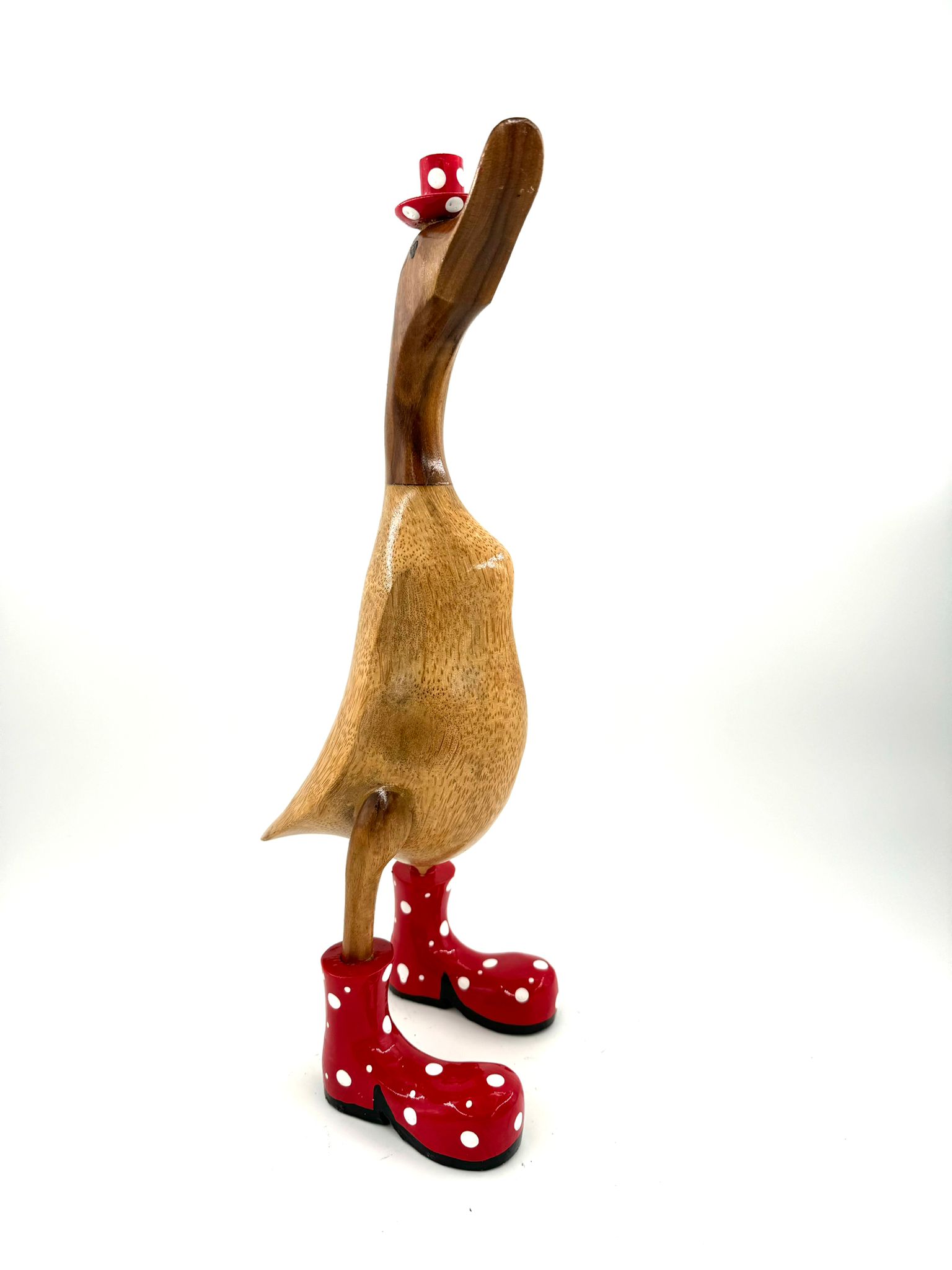 Die Pedi-Holzente bringt Farbe und Liebe in dein Zuhause! Mit ihrem roten Hut und den Regenstiefeln trotzt sie jedem Wetter und verbreitet gute Laune. Sie ist fleißig und liebenswert, eine perfekte Ergänzung für jede Sammlung. Hol sie dir jetzt und lass dich von ihrem Charme begeistern! 40cm hoch.