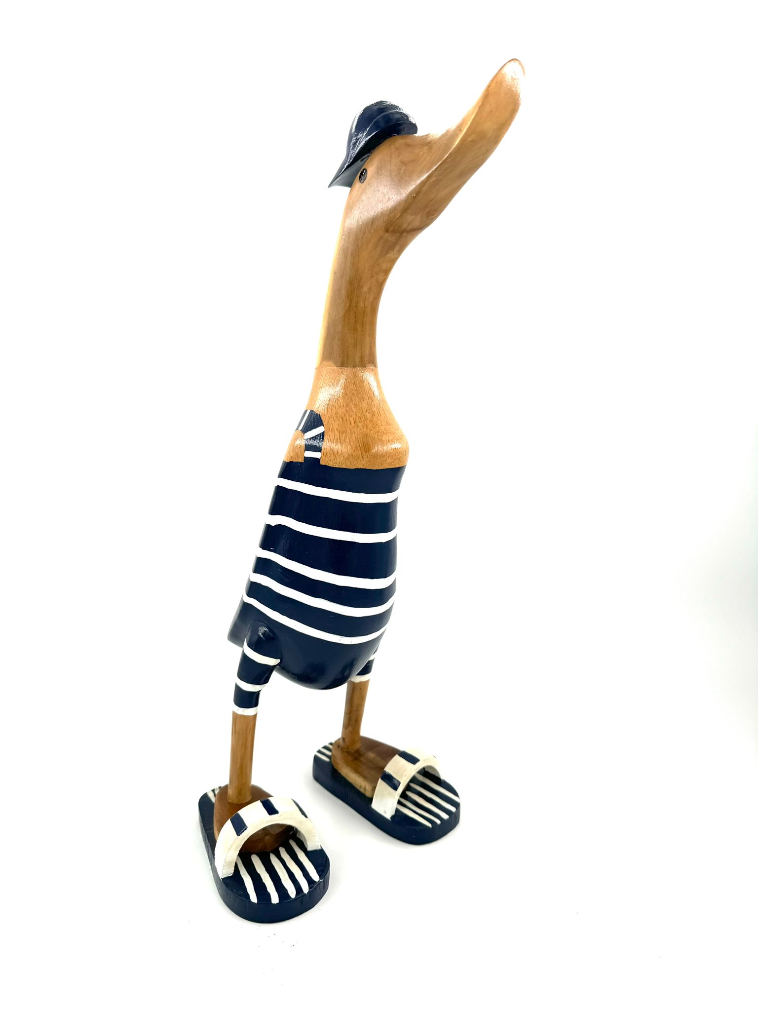 Klaus, die liebevoll handbemalte Holzente, ist 40cm hoch und ein begehrtes Sammlerstück mit einem einzigartigen Holzbein. Perfekt für alle Entenliebhaber und Sammler von außergewöhnlichen Stücken. Einfach quacktastisch!